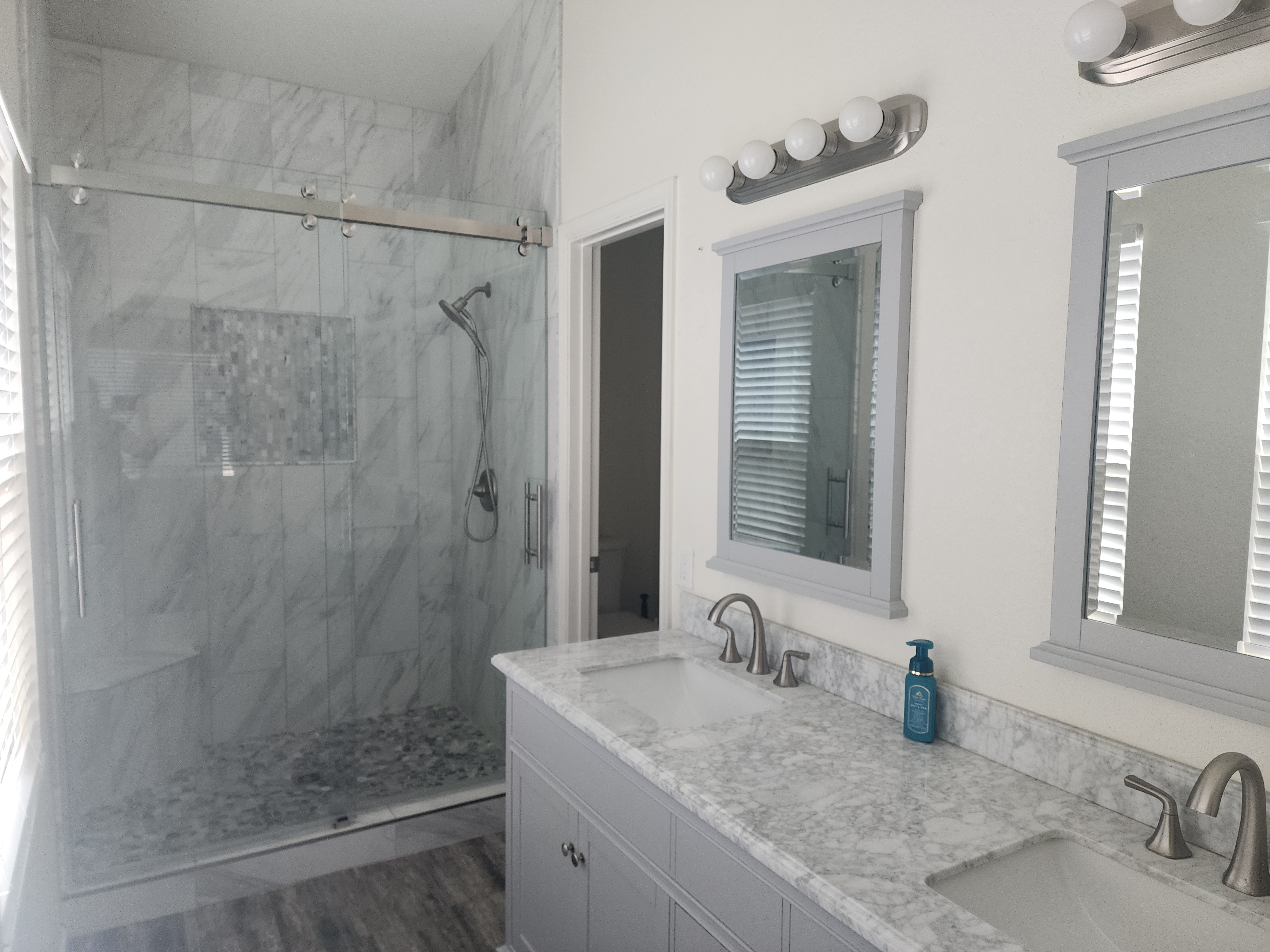 PRIMARY BATHROOM WITH NEW (2024) FIXTURES AND MODERN DUAL VANITY WITH GRANITE COUNTERTOP |