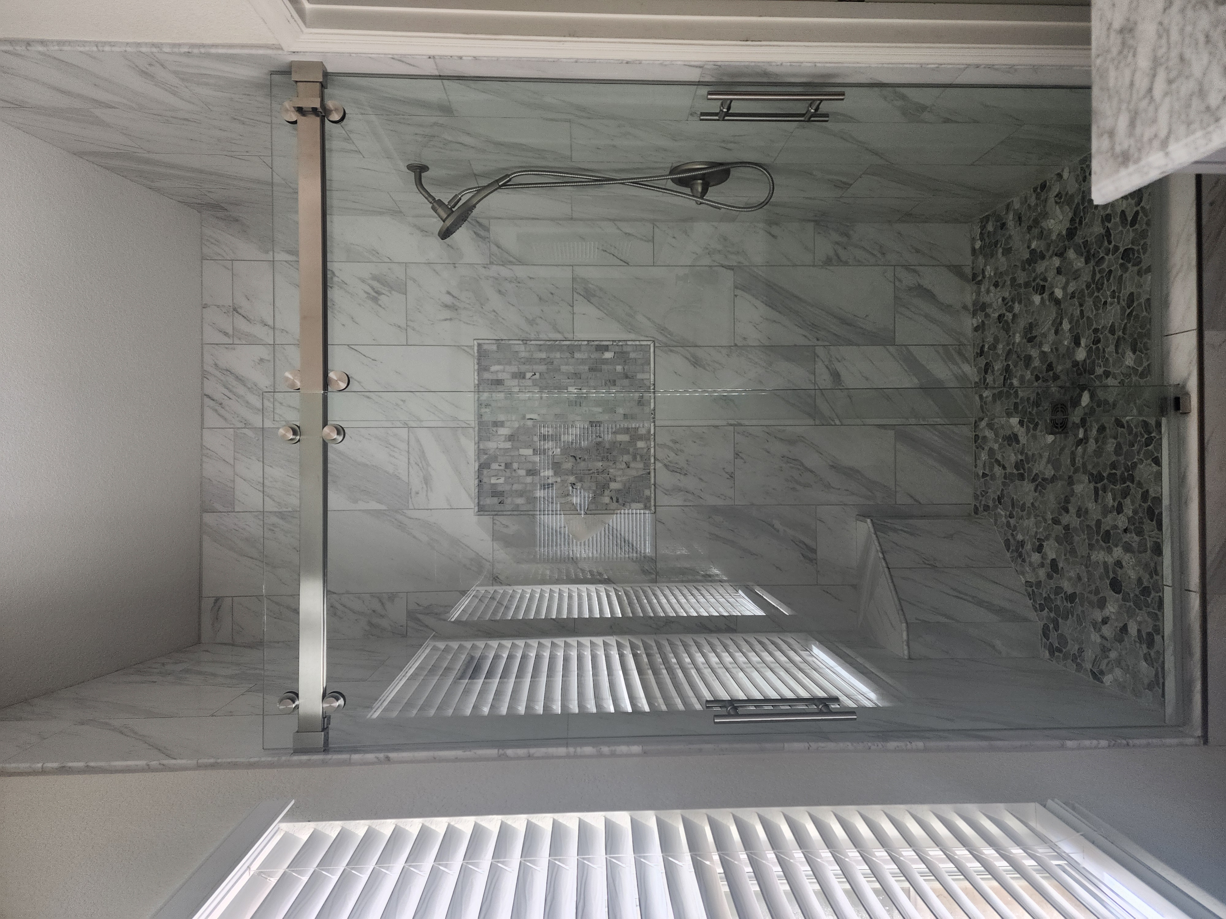 PRIMARY BATHROOM WITH STUNNING NEW (2024) MARBLE TILE SHOWER AND FIXTURES |